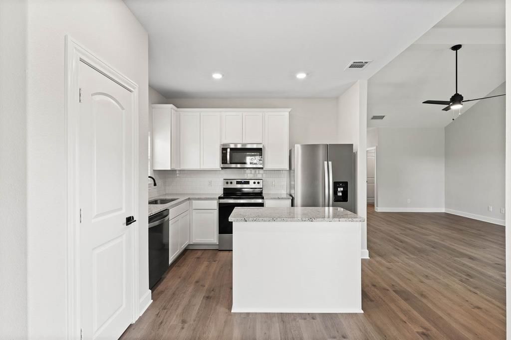 This delightful three-bedroom residence offers meticulously designed living space tailored for comfort and functionality. The kitchen impresses with designer cabinetry, expansive granite countertops and Whirlpool® appliances. The adjacent family room is an ideal spot for relaxing and spending time with the family. The flex room offers versatility, serving as a dynamic space that caters to changing needs as a home office, workout area, vibrant playroom or game room. The charming covered back patio, nestled within a fully fenced backyard, adds yet another layer of appeal, serving as an idyllic venue for hosting backyard barbecues with loved ones, promising countless moments of happiness and relaxation.